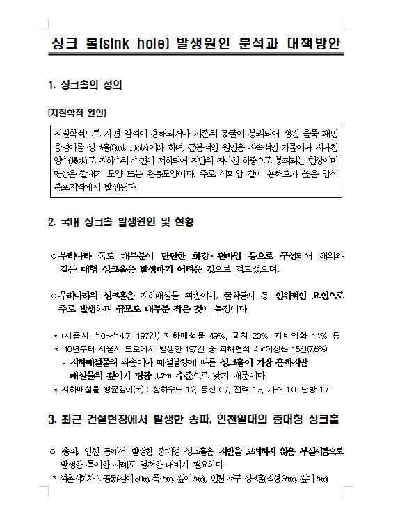 델파이기법을 이용한 싱크홀 발생 위험요인 도출 75 싱크홀. 싱크홀 원인 조사와 복구 작업은 13일 오전부터 이뤄질 예정이다.